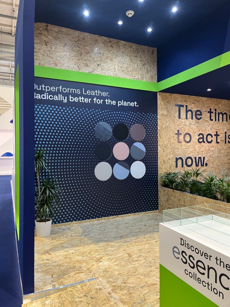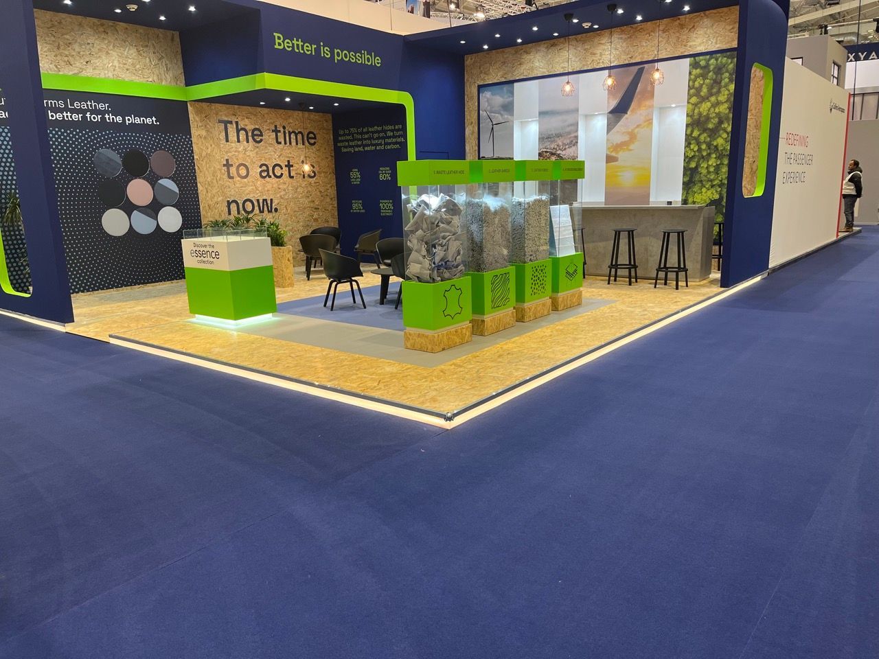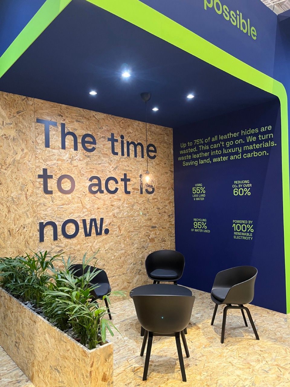 We focused our attention on creating a layout which would clearly showcase the journey within the manufacturing process. We then sourced reclaimed sterling board (chip board effect) to create a sustainable aesthetic and added bold messaging and statistics to reinforce E-Leathers credentials.