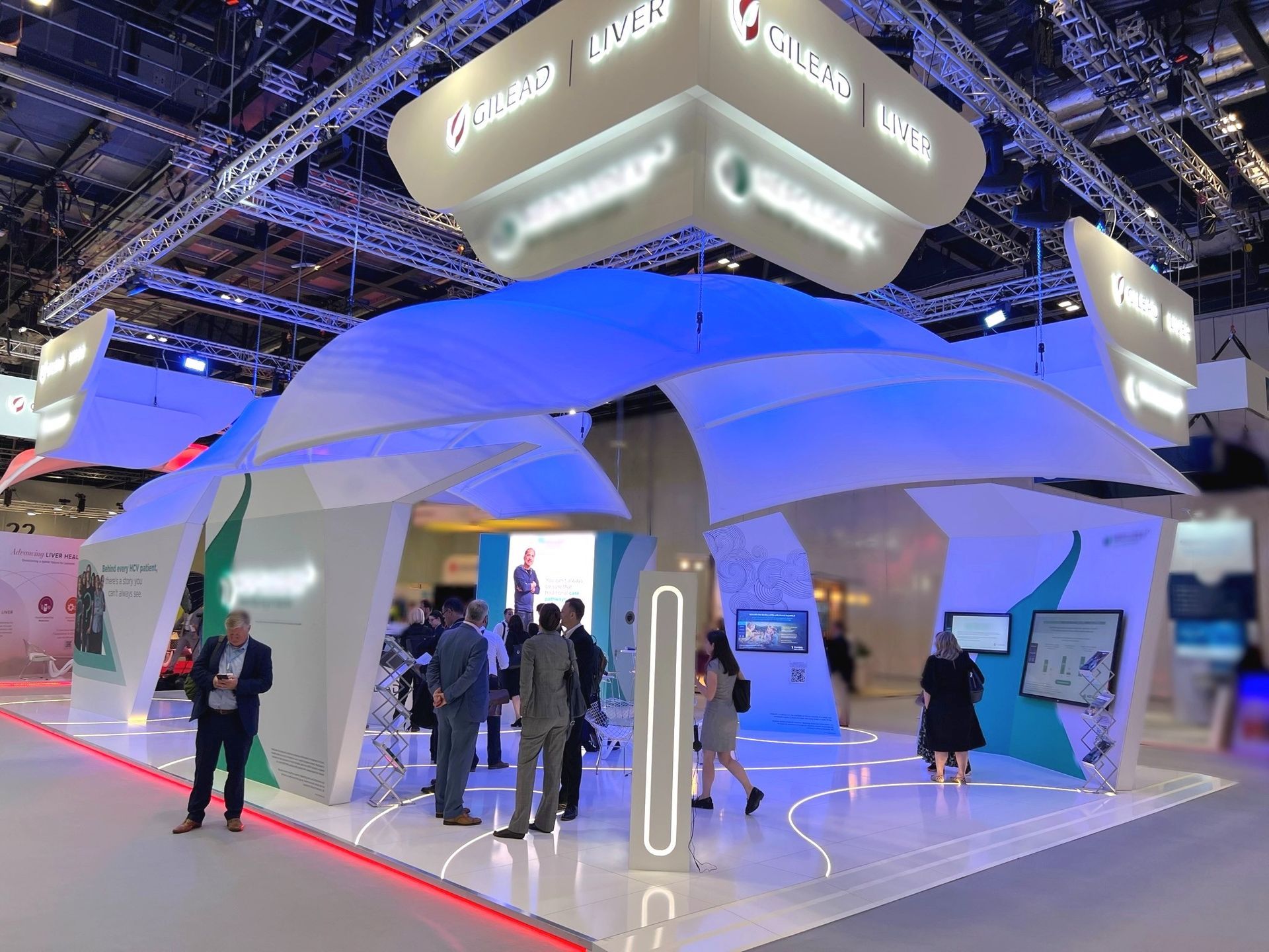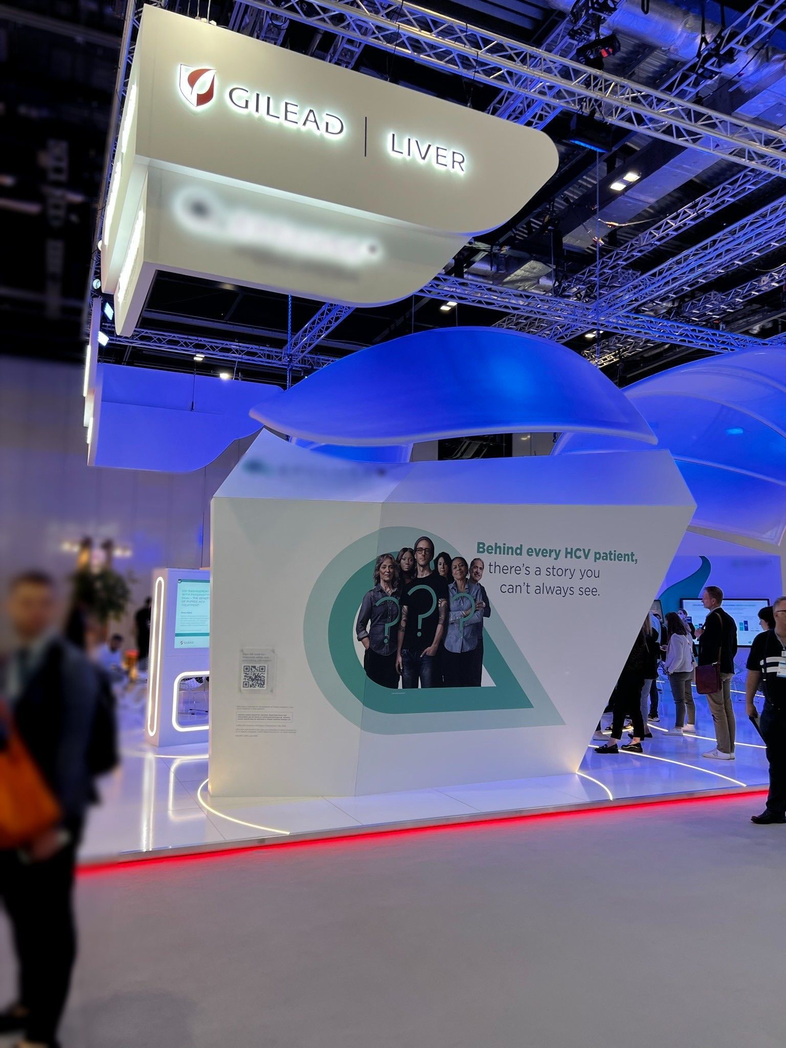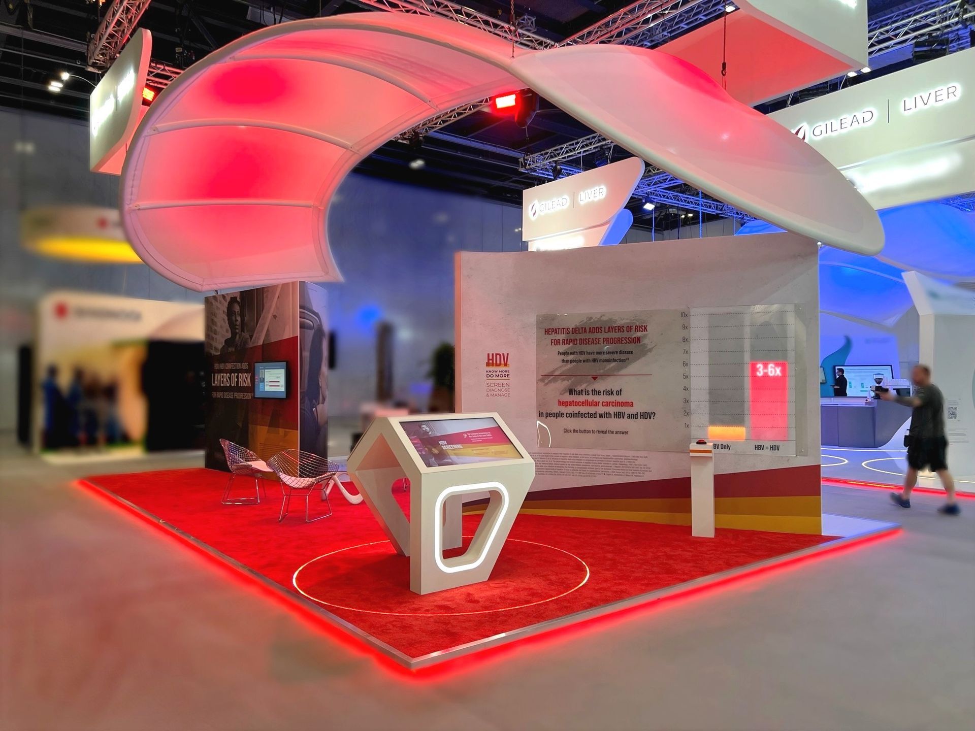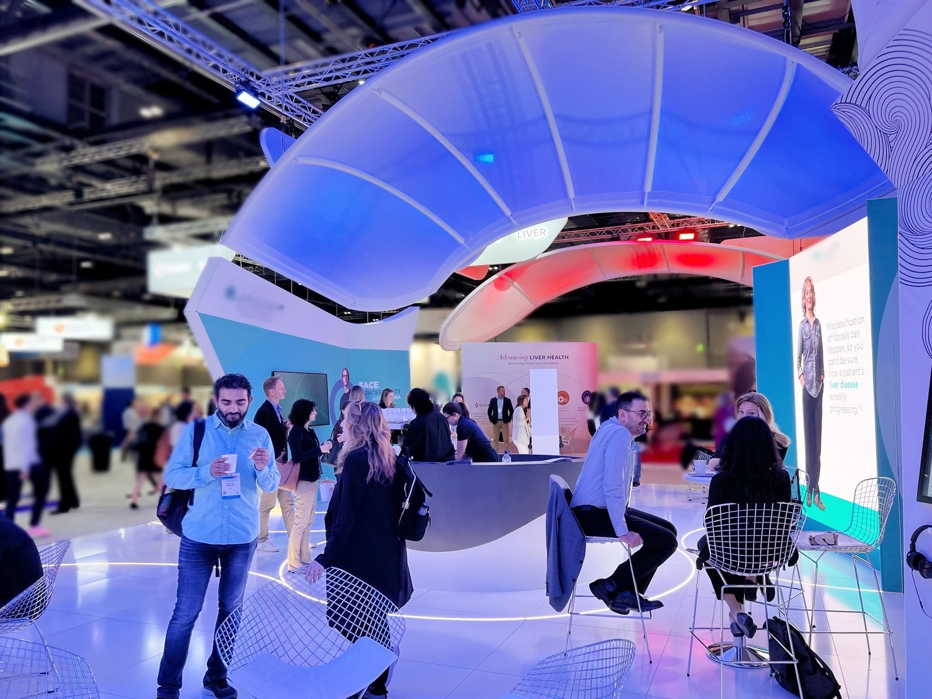 Using custom made suspended, liver shaped fabric structures and fully controllable LED lighting to create movement and atmosphere. We created an immersive space to showcase both brands with the use of touch screen technology and a large LED feature wall. The second space was split between disease awareness and and Liver franchise with further touch screen interactive elements. Coffee and smoothie services drew in delegates to engage with cleverly displayed content.