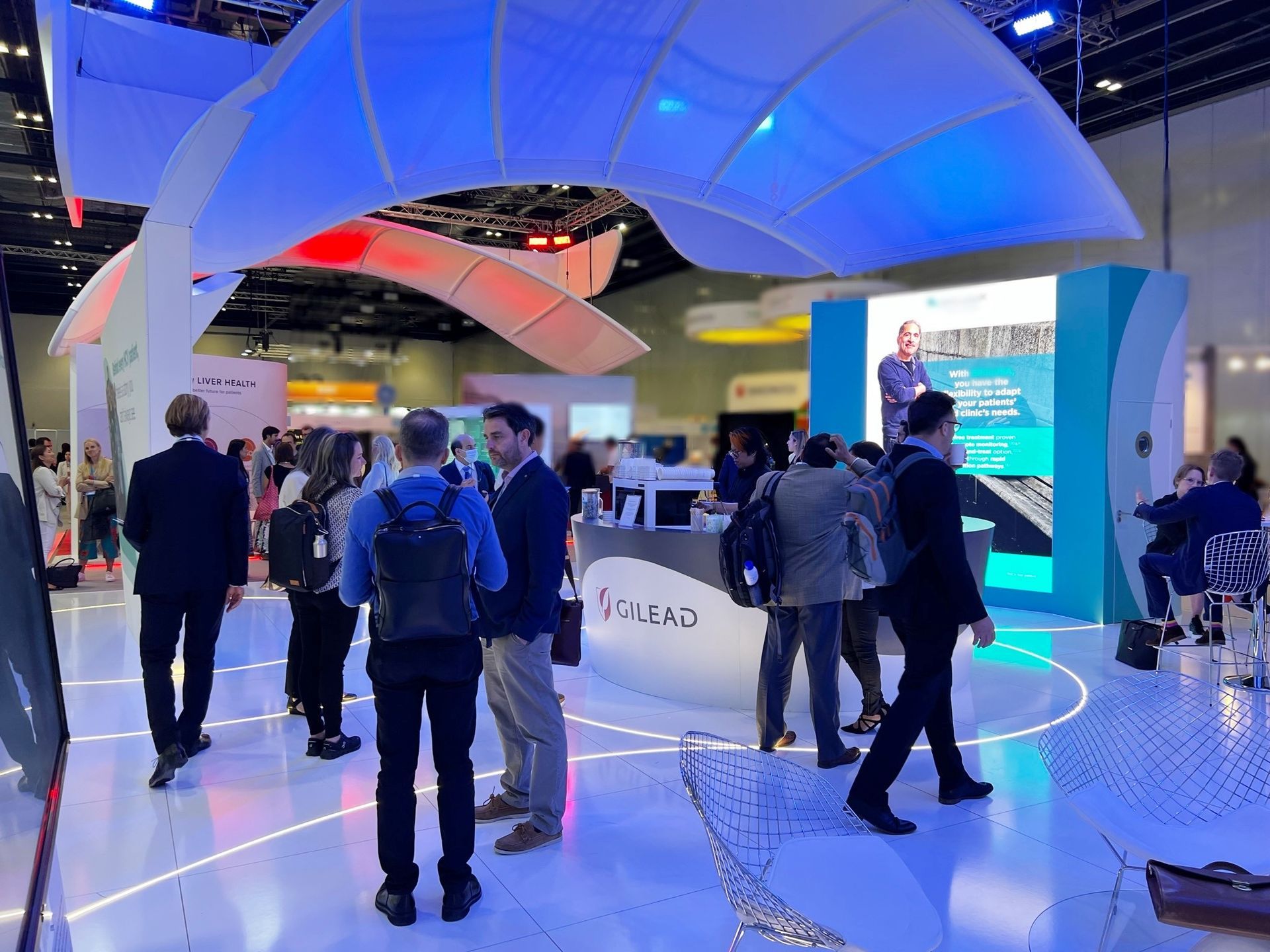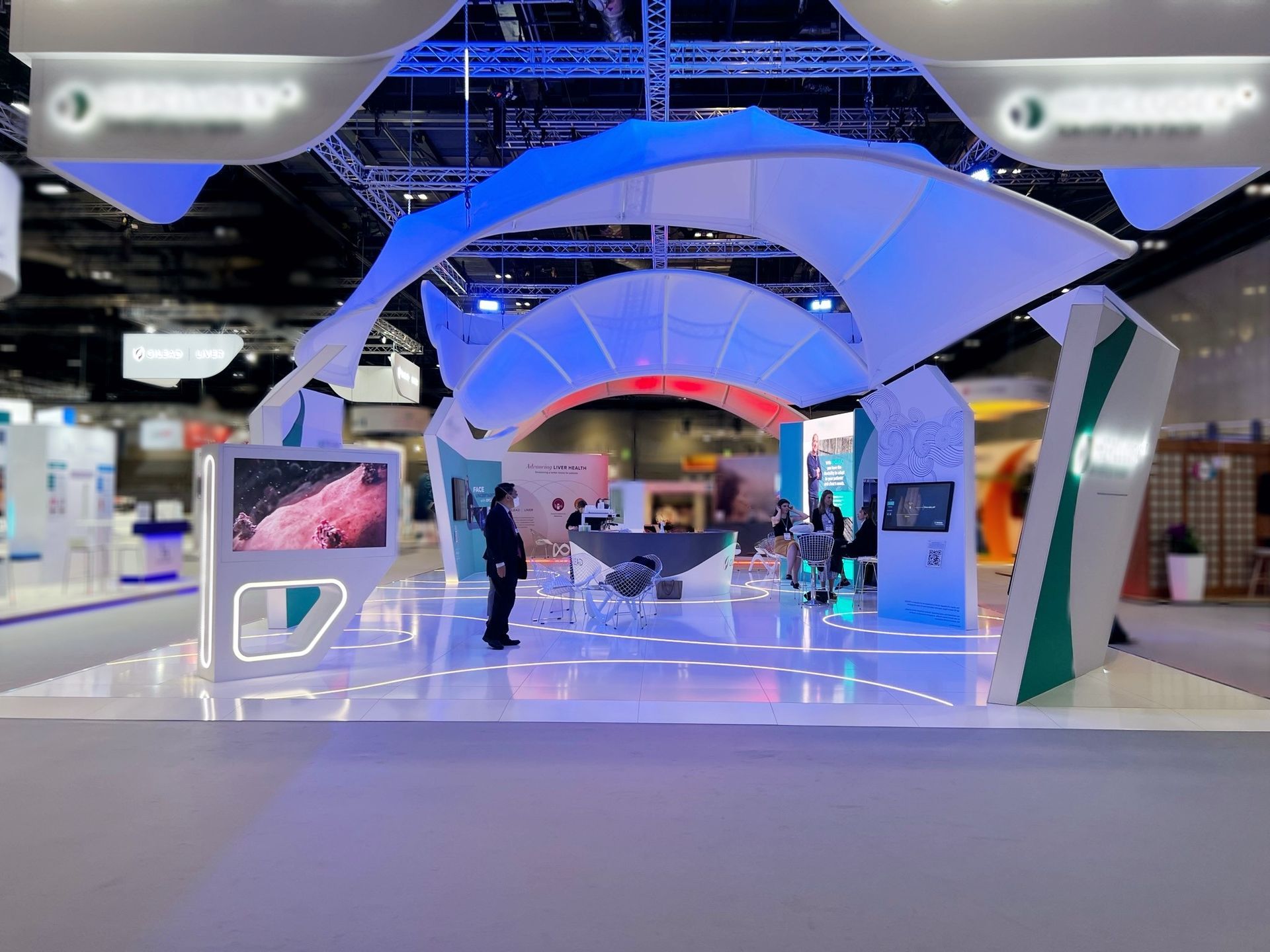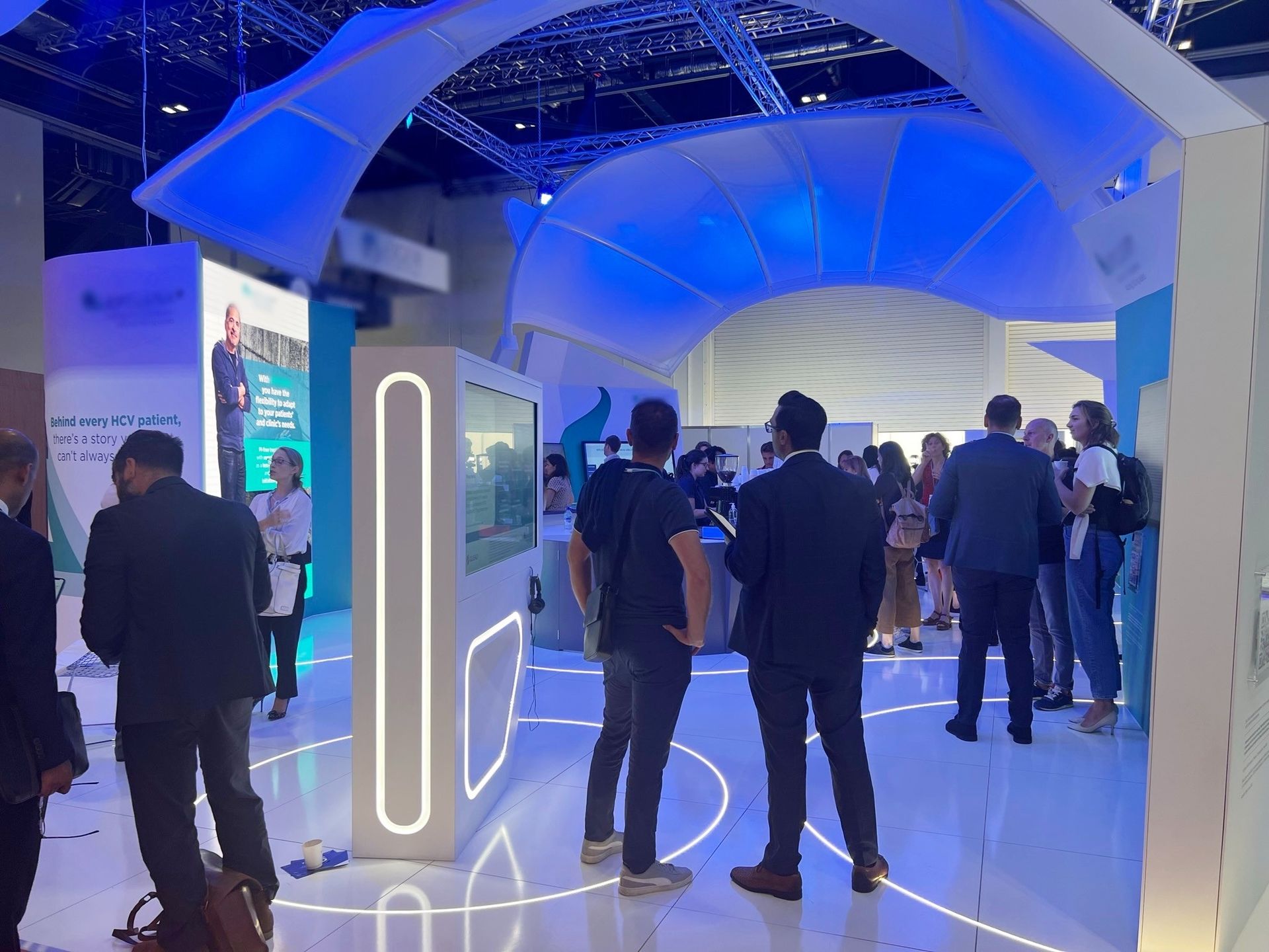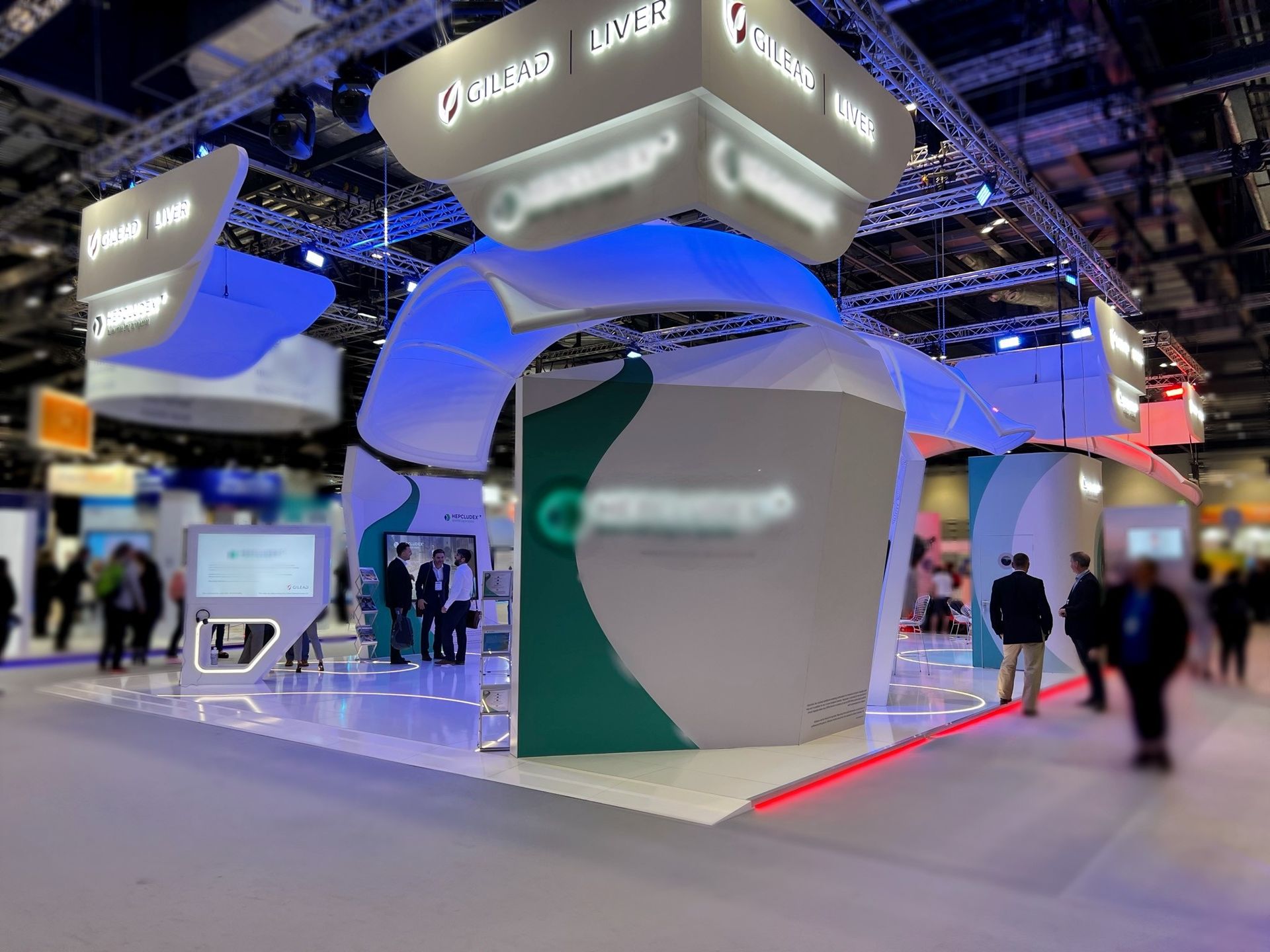 Using custom made suspended, liver shaped fabric structures and fully controllable LED lighting to create movement and atmosphere. We created an immersive space to showcase both brands with the use of touch screen technology and a large LED feature wall. The second space was split between disease awareness and and Liver franchise with further touch screen interactive elements. Coffee and smoothie services drew in delegates to engage with cleverly displayed content.